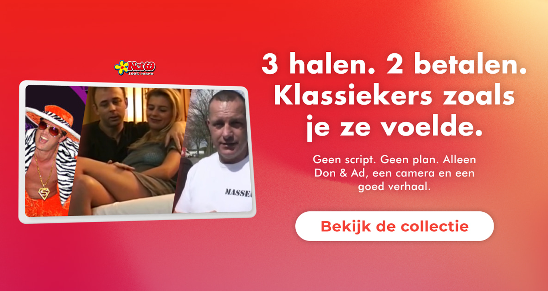 “Ik was het zat om steeds tussen advertenties door te moeten scrollen. Bij NET69 kijk je gewoon wat je wil, zonder geneuzel. Mijn vriendin snapt er niks van, maar ik zit elke week trouw met Don & Ad op de bank. Aanrader!”